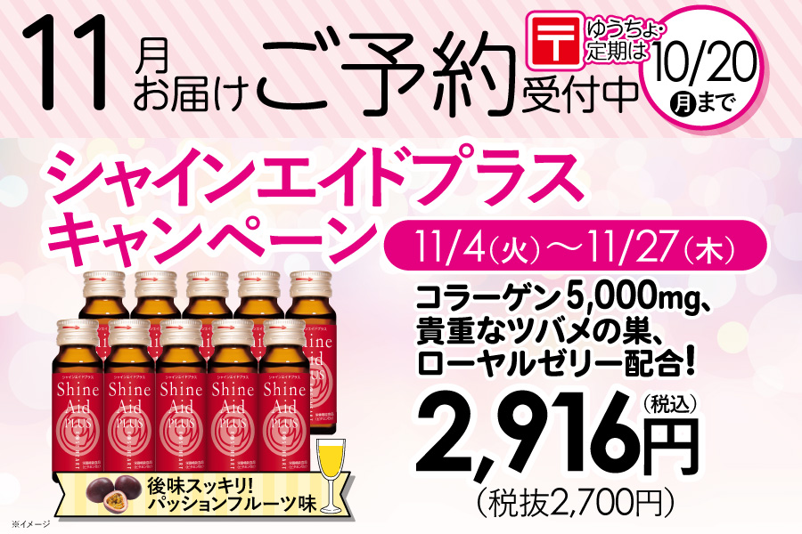 11/4(火)~11/27(木)に開催いたします、コラーゲン5,000mgと、貴重なツバメの巣、そしてローヤルゼリーを配合した美容&健康ドリンク!【シャインエイドプラス】が特別価格でご購入いただける、とってもお得なシャインエイドプラス キャンペーンについて大切なお知らせです。