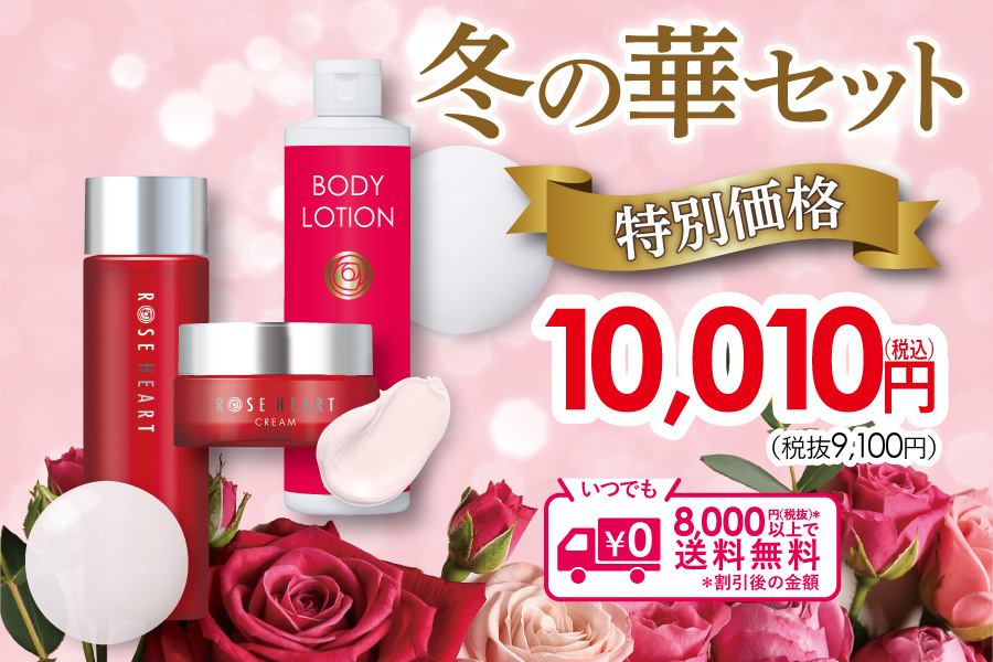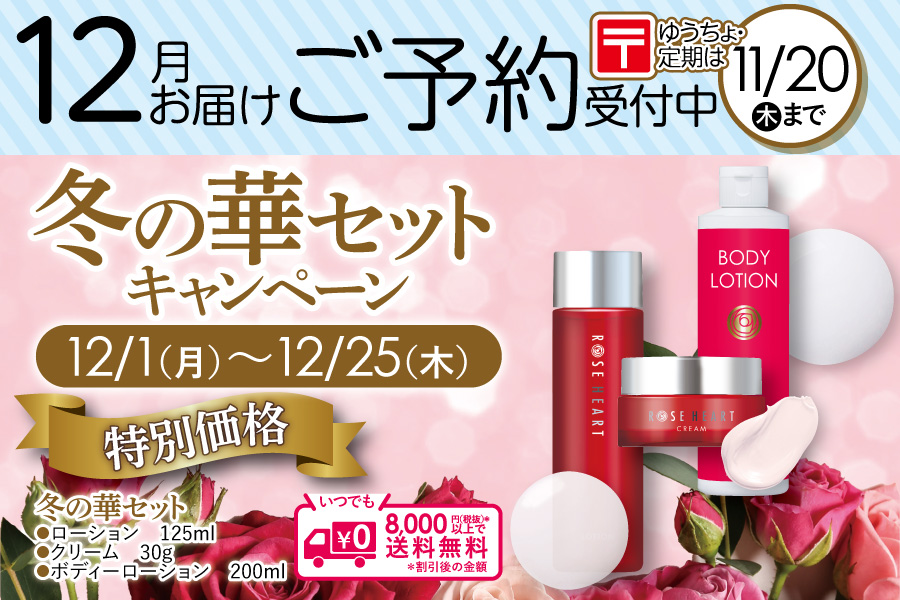 12/1(月)~12/25(木)に開催いたします、ベストセラースキンケアのローションとクリーム、全身をみずみずしく潤すボディーローションを特別価格でセットにした、とってもお得な冬の華セットキャンペーンについて大切なお知らせです。