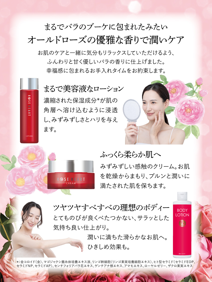 お肌のケアと一緒に気分もリラックスしていただけるよう、ふんわりと甘く優しいバラの香りに仕上げました。