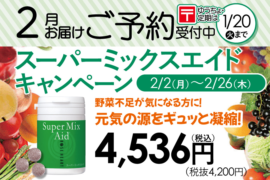 2/2(月)~2/26(木)に開催いたします、話題の栄養素ファイトケミカルを手軽に補給できる【スーパーミックスエイド】が特別価格でご購入いただける、とってもお得な【スーパーミックスエイド キャンペーン】について大切なお知らせです。