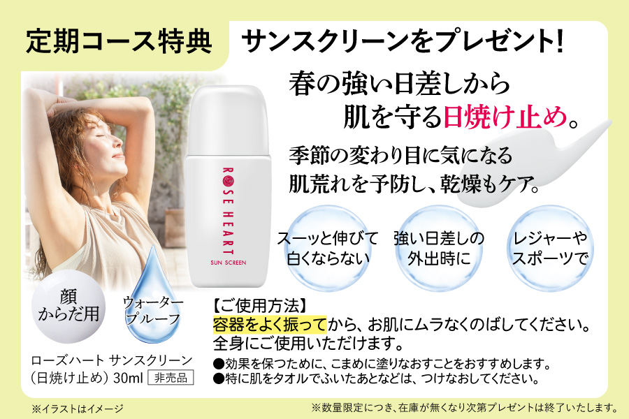 定期コース特典としてローズハートオリジナルのサンスクリーン-非売品-をプレゼントいたします。