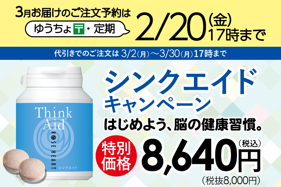 3/2(月)~3/30(月)に開催いたします、話題の健康成分PS(ホスファチジルセリン)やL-テアニンを配合した健康食品シンクエイドを特別価格でご購入いただける、とってもお得なシンクエイドキャンペーンのご予約を受付中です。