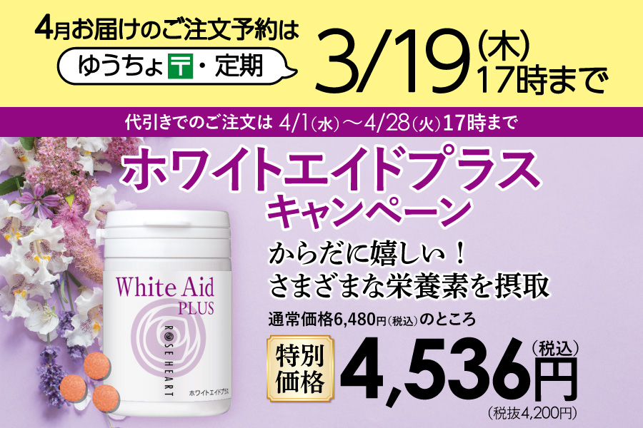 4/1(水)~4/28(火)に開催いたします、適切な栄養補給で明るい日々をサポートする【ホワイトエイドプラス】が特別価格でご購入いただける、とってもお得なホワイトエイドプラスキャンペーンについて大切なお知らせです。