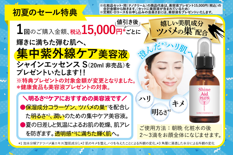 1回のご購入金額が15,000円(税込)*ごとに集中紫外線ケア美容液 シャインエッセンスS(内容量:20ml)[非売品]を1個プレゼントいたします!