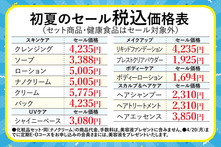 5/1(金)~6/29(月)に開催いたします、スキンケア・メイクアップ・ボディーケア・ヘアケアが特別価格でご購入いただける、とってもお得な初夏のセールについて大切なお知らせです。