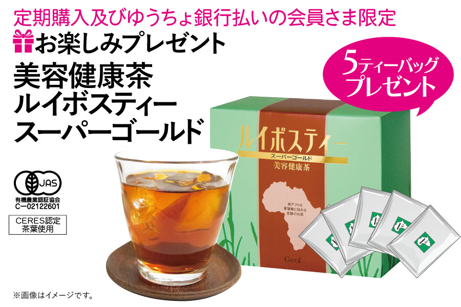 ルイボスティー(5袋)は、定期コースのご注文及び、ゆうちょ銀行払いをご利用の会員さま限定のプレゼントです。