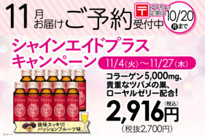 【11月お届け・予約終了|シャインエイドプラス キャンペーン〈~10/20まで〉】 コラーゲン5,000mgと、貴重なツバメの巣、ローヤルゼリーを配合した美容&健康ドリンク、シャインエイドプラスが特別価格に! さらに、3箱まとめてご購入で、もう1箱プレゼント!