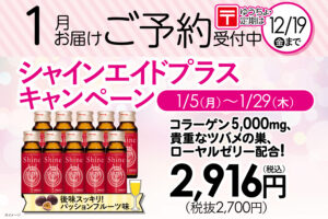 【1月お届け・予約受付中|シャインエイドプラス キャンペーン〈~12/19まで〉】 コラーゲン5,000mgと、貴重なツバメの巣、ローヤルゼリーを配合した美容&健康ドリンク、シャインエイドプラスが特別価格に! さらに、3箱まとめてご購入で、もう1箱プレゼント!